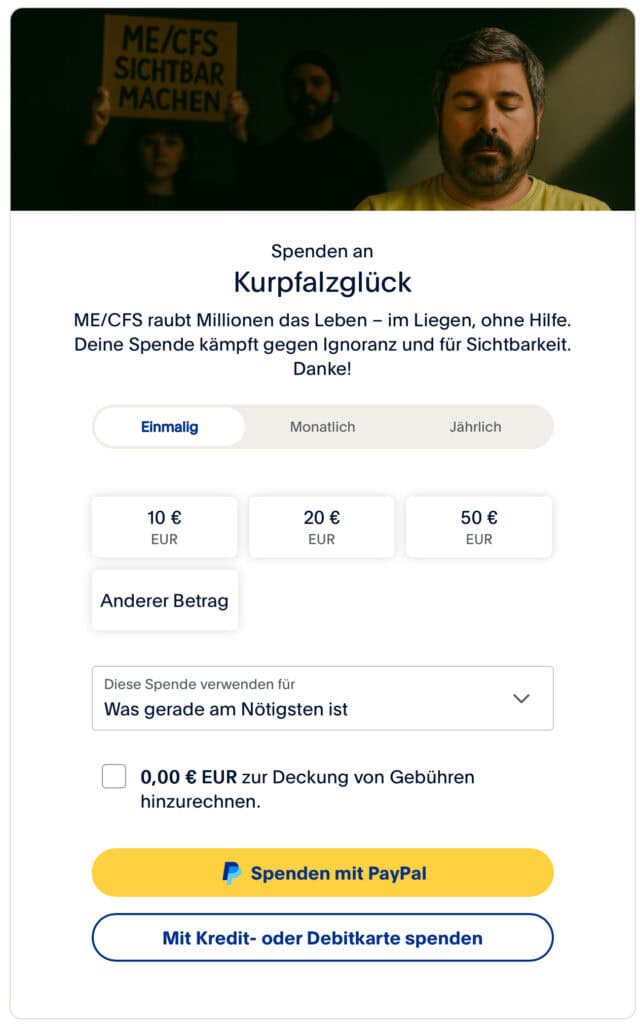 Wenn du lieber eine anerkannte, gemeinnützige Organisation unterstützen möchtest, kannst du hier direkt an die ME/CFS Research Foundation (Deutschland) spenden: